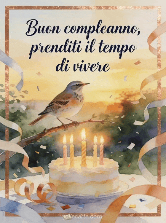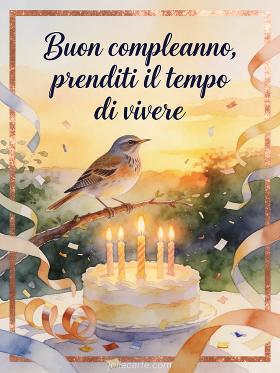 Invia un messaggio di compleanno sereno con un tordo su un ramo sopra candele accese. Nastri, coriandoli e una foresta dorata ad acquerello creano una celebrazione calma intorno all'invito a prendersi il tempo di vivere. Scopri anche una poesia di compleanno per mio figlio, una poesia di compleanno per mio figlio o un buon compleanno mio figlio adulto.