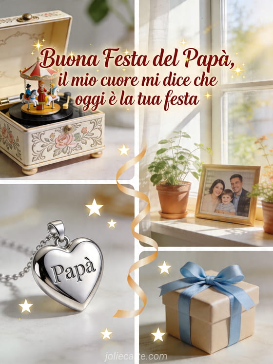 Condividi un biglietto commovente per la Festa del Papà con un piccolo carillon, un ciondolo a cuore, un davanzale illuminato dal sole e un regalo incartato con nastro blu. Questo collage realistico porta un bagliore tenero ed emotivo al giorno di papà. Scopri anche biglietti per la festa del papà, un biglietto gratuito festa del papà o festa del papà a mio figlio.