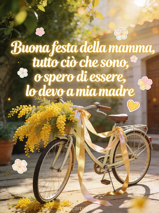 Condividi un biglietto radioso con un cortile soleggiato, rami di mimosa, una bicicletta vintage e nastri di seta. Puoi inviare anche poesie per la festa della mamma, un gioco di parole festa della mamma o buona festa della mamma mia nuora.