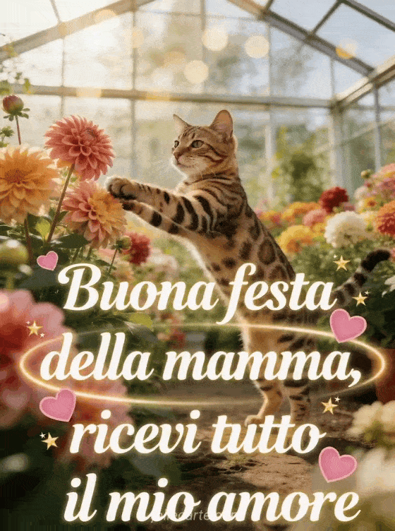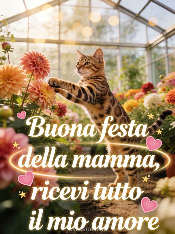 Condividi poesie della festa della mamma in un biglietto realistico con un gatto bengal che si stiracchia tra dalie in fiore in una serra luminosa, cuori rosa, piccole stelle dorate e luce calda. Scopri anche fotografia per la festa della mamma, parole tenere per la festa della mamma o poesia per la festa della mamma.