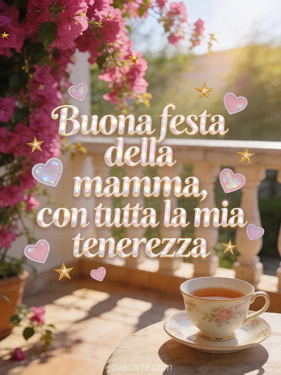 Condividi poesie festa della mamma con eleganti lettere perlate, cuori pastello, piccole stelle dorate e una terrazza assolata con fucsia ricadente accanto a una tazza in porcellana. Questo biglietto tenero porta tutta la tua tenerezza nella luce di primavera. Scopri anche rime per la festa della mamma, fiore per la festa della mamma o buona festa della mamma suocera.