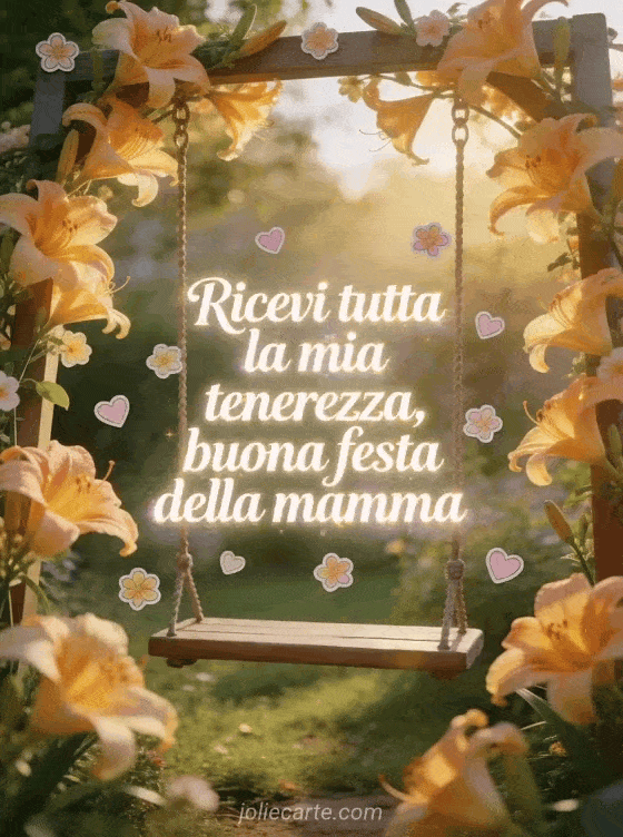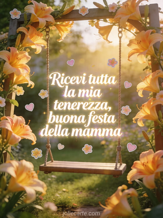 Condividi un augurio sereno con un'altalena da giardino incorniciata da emerocallidi luminose, piccoli fiori e cuori pastello nella luce calda del pomeriggio. Puoi inviare anche poesie alla festa della mamma, poesie per la festa della mamma o un gioco di parole festa della mamma.