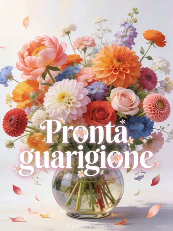 Condividi questa carta di pronta guarigione per portare conforto con un bouquet ricco e gioioso. Scopri anche augurare pronta guarigione a qualcuno, testo auguri di pronta guarigione e messaggi di pronta guarigione.
