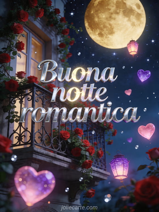 Augura una notte magica con questo biglietto gratis di buona notte romantica con rose, luce di luna e cuori luminosi sopra un balcone. Scopri anche baci di coppia nell'acqua, baci d'amore cuore cuore gif o citazione baci coppia.