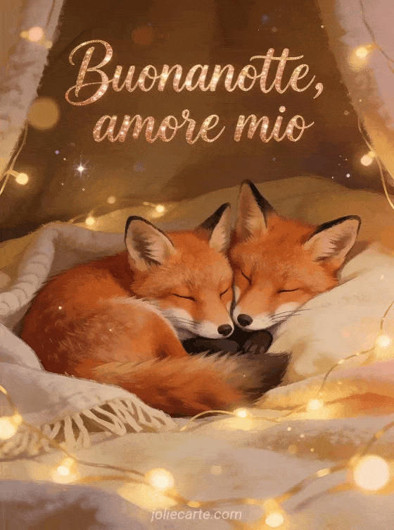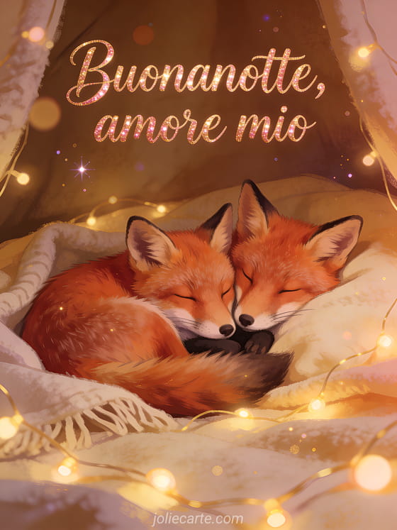 Invia un romantico augurio di buonanotte all'amore della tua vita con questa bella cartolina gratis. Una coppia di volpi accoccolate sotto luci di fata, perfetta per una buonanotte tenera. Scopri anche una cartolina ti amo buonanotte amore mio o una cartolina buonanotte ti amo amore mio gif.