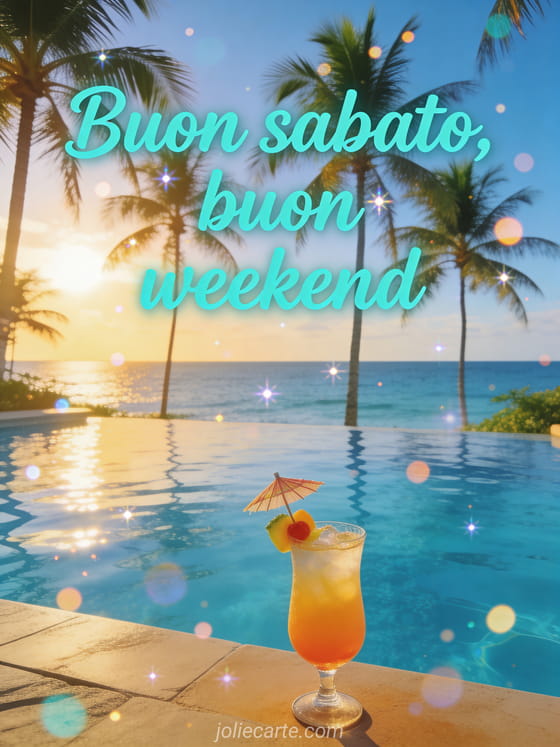 Condividi un saluto solare di buon sabato e buon weekend con una splendida piscina a sfioro affacciata sull'oceano tropicale, palme e un cocktail esotico. Scopri anche buongiorno buon sabato immagini, buon sabato al caldo o buongiorno buona giornata buon sabato.
