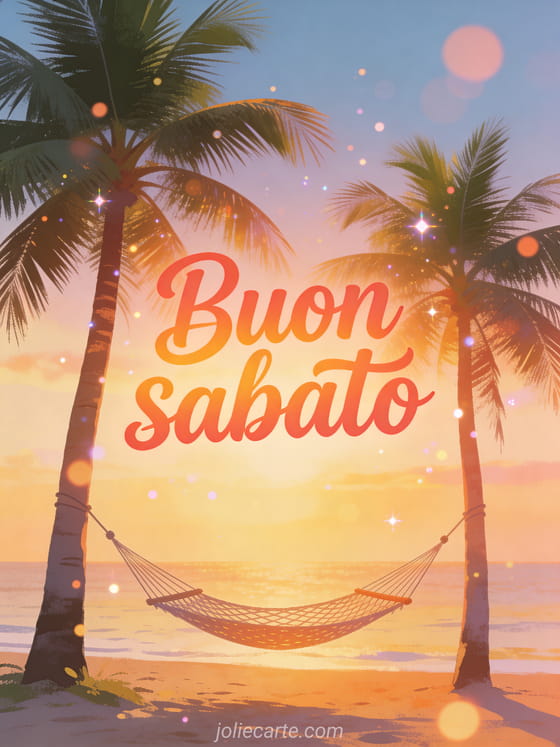 Condividi sabato buon weekend con un'amaca tra le palme sulla spiaggia nella scena perfetta di relax del weekend. Continua l'umore soleggiato con sabato buon weekend buon sabato, buongiorno buon sabato immagini o buon sabato al caldo.