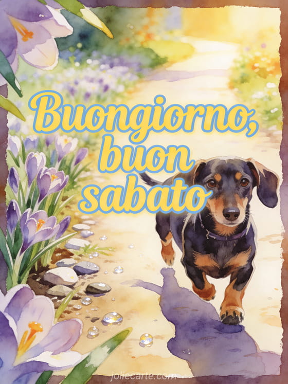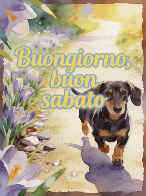 Invia sabato buongiorno gif con lettere gialle e solari, un bassotto che trotta accanto a un sentiero da giardino, petali di crocus freschi e piccole pietre bagnate di rugiada nella luce dorata. Potrebbero piacerti anche questo buon sabato con il sole immagine, questa gif buon sabato baci o questo buon sabato amico mio immagine.