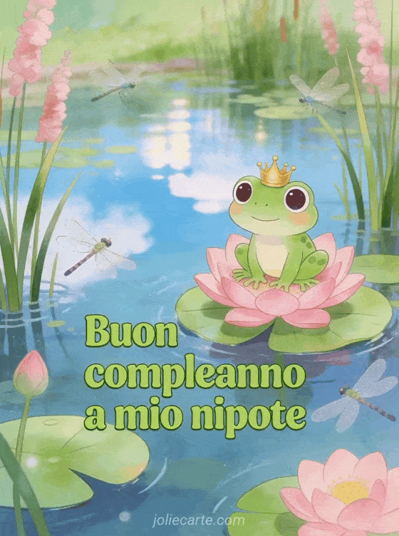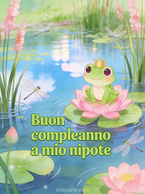 Invia a tuo nipote un augurio da fiaba con una rana verde carina che indossa una piccola corona dorata su una ninfea rosa, con libellule e canne. Scopri anche buon compleanno mio nipote, augurare buon compleanno a tuo nipote o augurare buon compleanno a mio nipote.