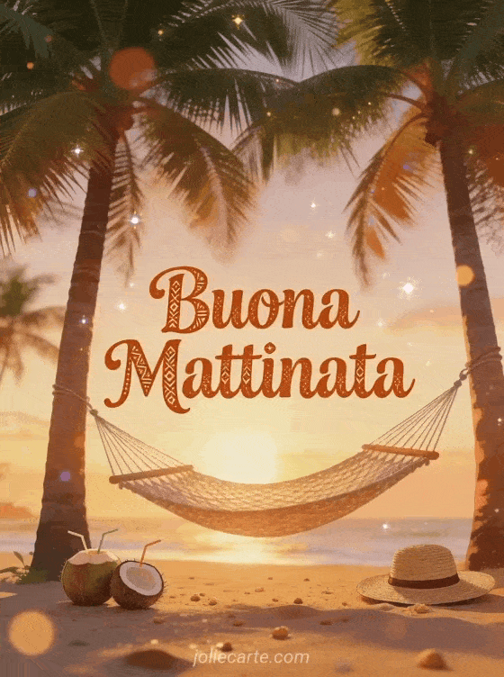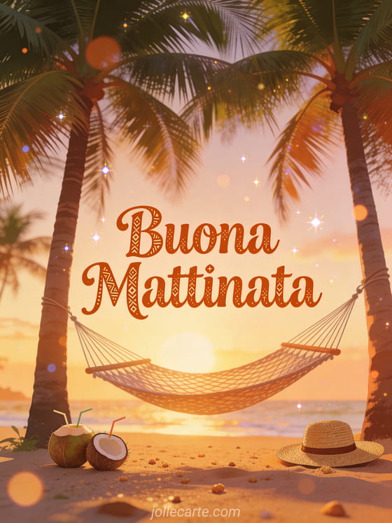 Condividi una bellissima cartolina di SMS di buona mattinata con un'amaca accogliente tra le palme su una spiaggia tropicale all'alba con bevande di cocco e cappello di paglia. Scopri anche una cartolina messaggio buongiorno, una immagine animata buona mattinata o una cartolina buongiorno foto.