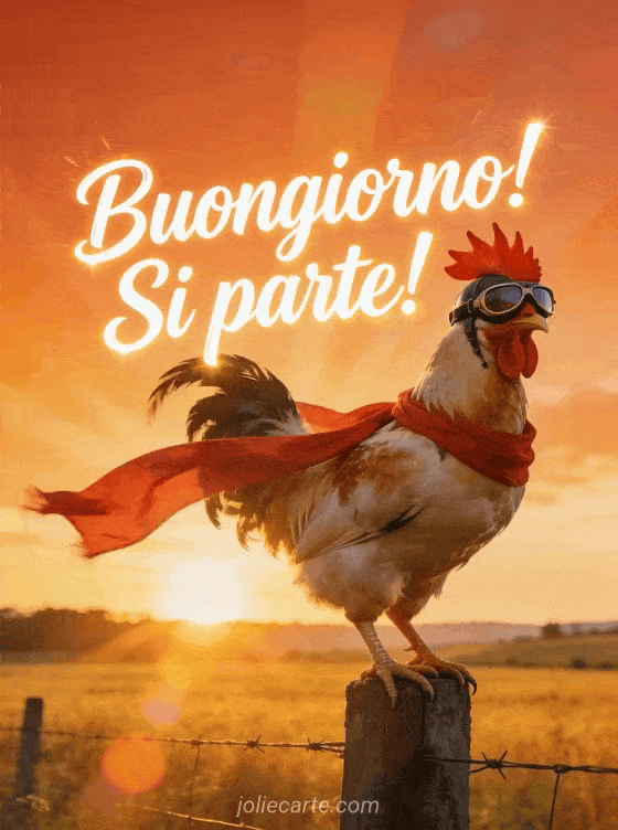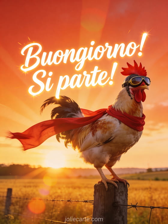 Inizia la giornata con questo divertente SMS di buongiorno romantico con un gallo fiero con occhiali da aviatore. Guarda anche gif animati buongiorno divertenti o immagine buongiorno umorismo.