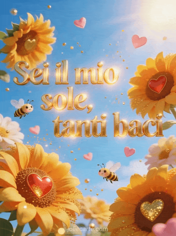 Invia questa gioiosa cartolina con le parole Sei il mio sole, tanti baci scritte in lettere dorate con luce solare calda, con girasoli giganti con cuori rossi e dorati al centro, api adorabili che volano tra i fiori sotto un cielo azzurro soleggiato. Scopri anche una immagine animata baci d'amore o una amore abbraccio baci sul collo.