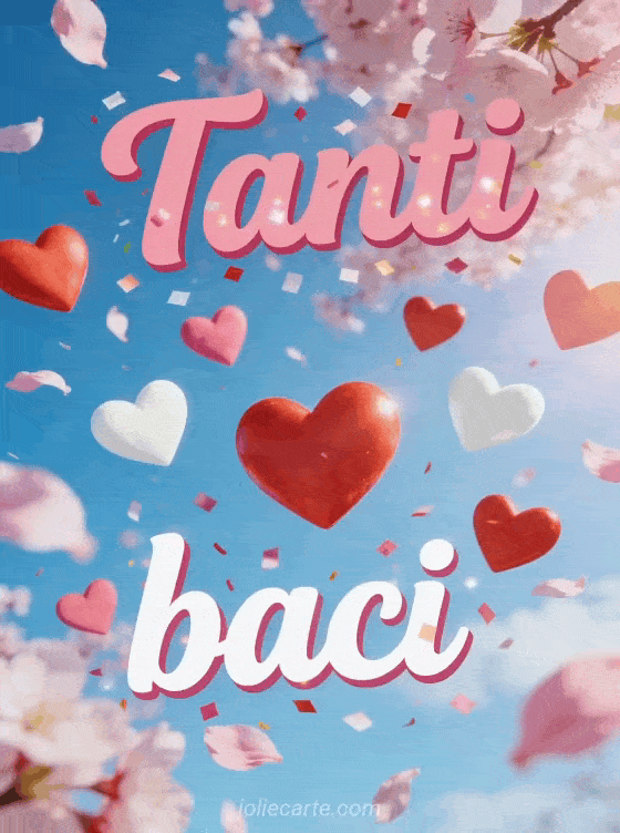 Manda tanti baci con questo allegro biglietto pieno di cuori rosa e petali di ciliegio che volteggiano in un cielo primaverile. Scopri anche baci tutti bagnati o disegno ragazza baci.