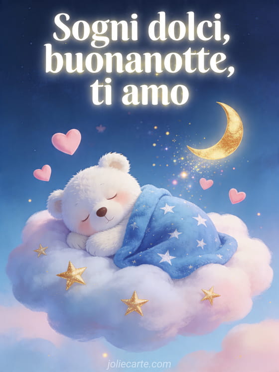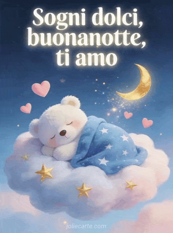 Augura sogni dolci con questo biglietto gratis della buonanotte con un orsetto addormentato, stelle dorate e un cielo soffuso illuminato dalla luna. Scopri anche mille baci dal cuore, romantico baci buona notte gif o immagine animata baci d'amore.