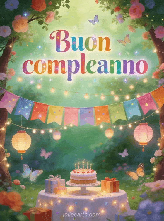 Festeggia con questo biglietto striscione buon compleanno bebè con festone colorato tra alberi fioriti, ghirlande luminose, farfalle, torta e regali in un giardino incantato. Scopri anche buon compleanno bebè gif, biglietto buon compleanno bebè e messaggio compleanno bambino divertente.