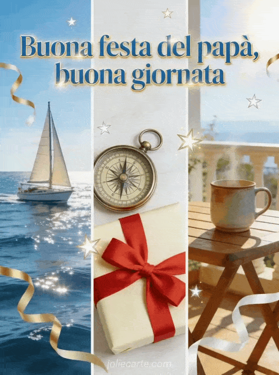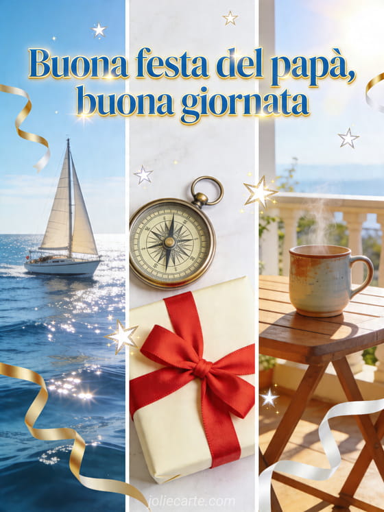 Augura a papà una buona giornata con un collage realistico per la Festa del Papà, con una barca a vela sull'acqua scintillante, una bussola accanto a un regalo con nastro e una terrazza soleggiata con tazza. Questo design arioso e gioioso è luminoso e festoso. Scopri anche modello di biglietto festa del papà, un biglietto facile per la Festa del Papà o immagini gratuite per la Festa del Papà.