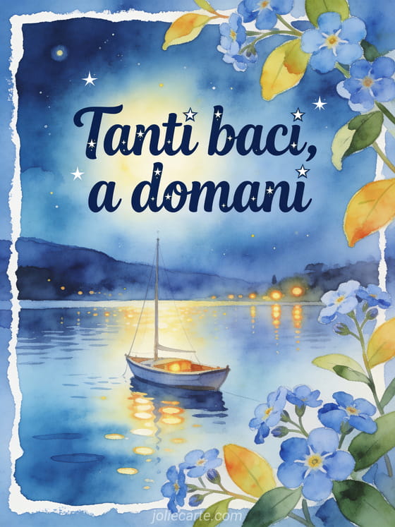 Condividi un augurio blu della sera con scritte audaci ad acquerello, non-ti-scordar-di-me oltre il bordo, una piccola barca a vela su un lago calmo, riflessi caldi e cielo notturno luminoso. Scopri anche un biglietto a domani baci gif animata, un biglietto baci della sera a domani o un biglietto tanti baci a domani.