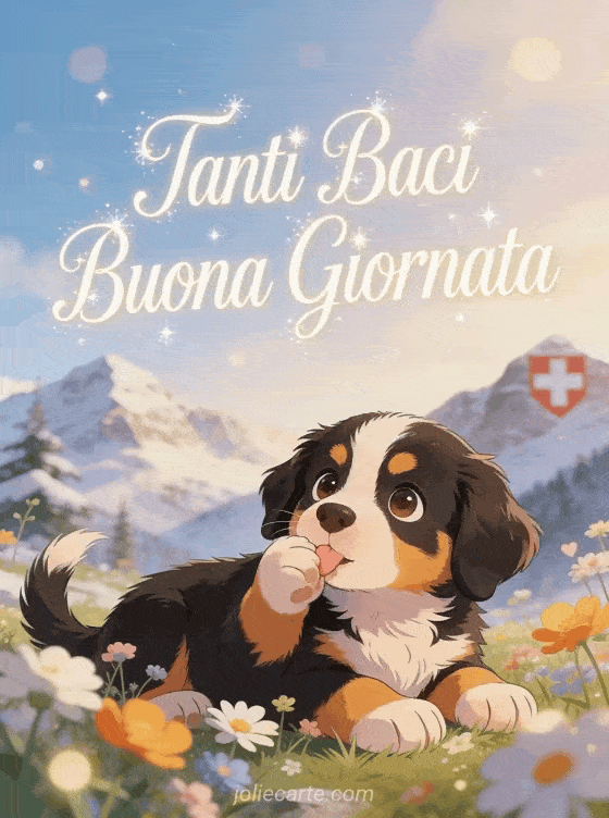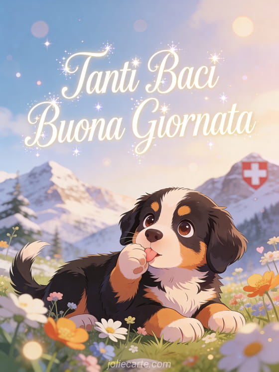Condividi calore con questa cartolina di tanti baci buona giornata con un adorabile cucciolo di Bovaro del Bernese circondato da fiori alpini nelle montagne svizzere. Scopri anche una cartolina di buongiorno amore mio buona giornata o di proverbio buona giornata.