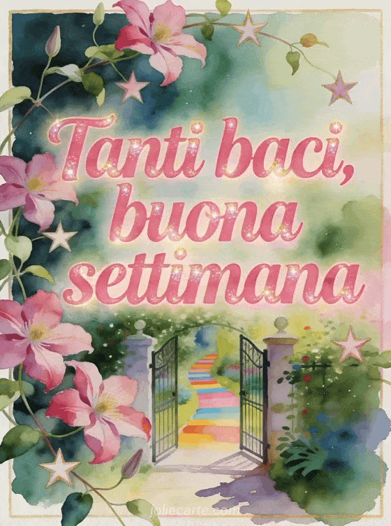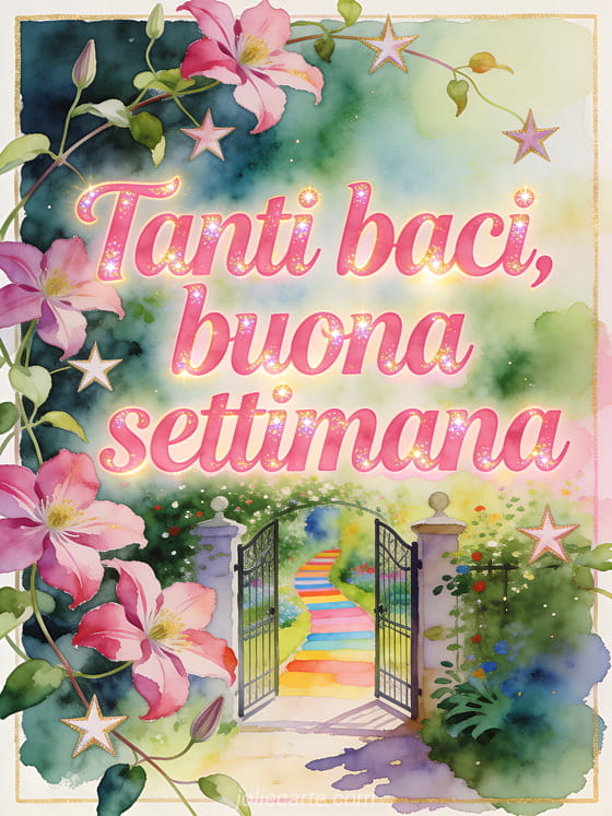 Condividi auguri sereni per la settimana con scritte rosa intenso, rampicanti di clematide e un cancello da giardino aperto verso un sentiero colorato nella luce dorata. Scopri anche un buona settimana a tutti baci, un biglietto buona settimana a te baci o un saluto buona settimana a tutti e a tutte.