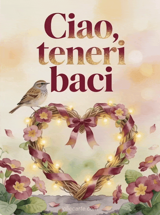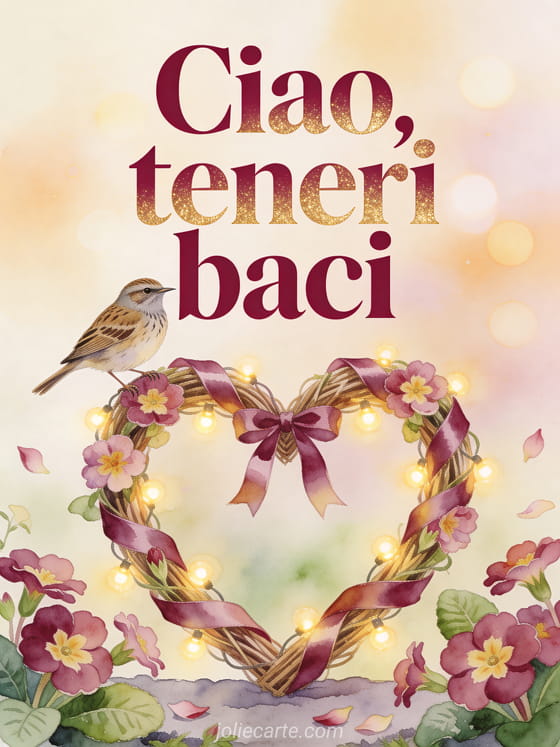 Condividi un saluto caldo con scritte color cranberry ad acquerello, un pipit posato accanto a una corona a forma di cuore intrecciata con primule, nastri di raso e luci di giardino brillanti. Scopri anche un ciao voi, un biglietto bella cartolina ciao tanti baci o un saluto ciao vita.