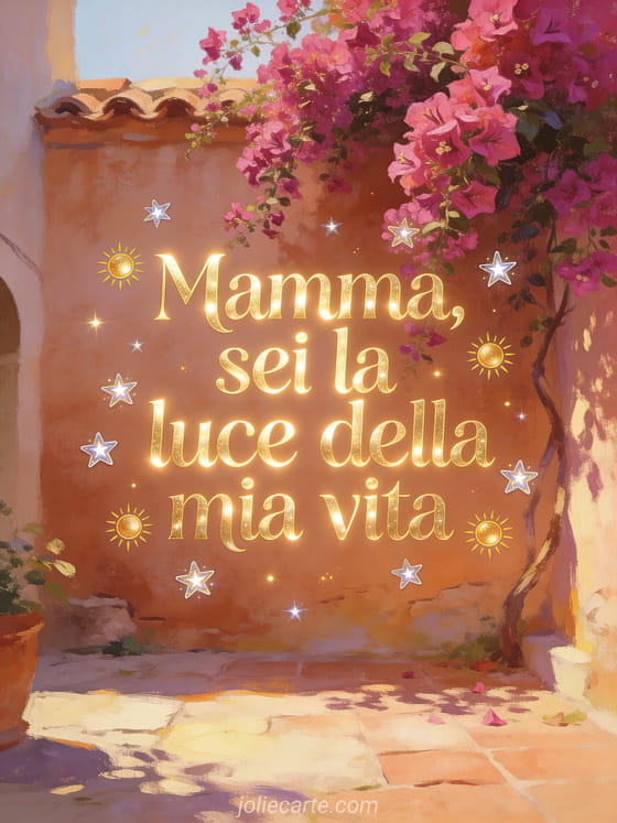 Di' alla mamma che è la luce della tua vita con questo bellissimo biglietto per la festa della mamma con lettere oro champagne e bouganville magenta. Scopri anche immagini buona festa della mamma o oggi è la festa della mamma.