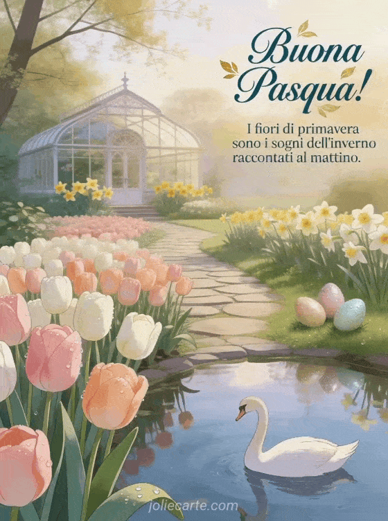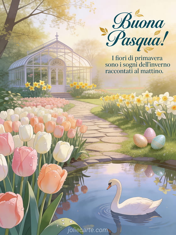 I fiori di primavera sono i sogni dell'inverno raccontati al mattino — un poetico biglietto di Pasqua con un cigno su un laghetto sereno a Keukenhof. Scopri anche un messaggio per la festa di Pasqua, Buona Pasqua GIF animate gratis o una cartolina di Pasqua gratuita.