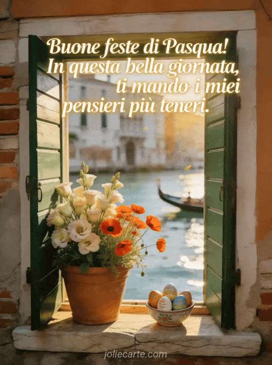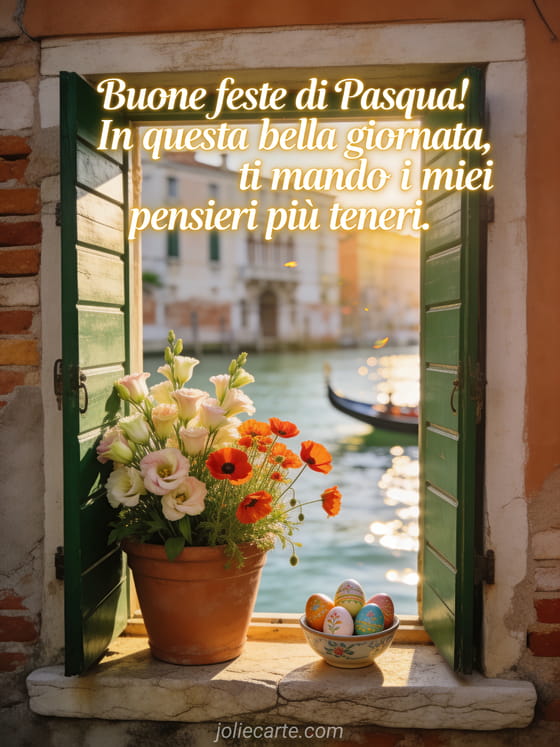 Invia questo testo tenero di Pasqua con una scena veneziana piena di fiori primaverili. Scopri anche una citazione Buona Pasqua o un messaggio di pasqua.