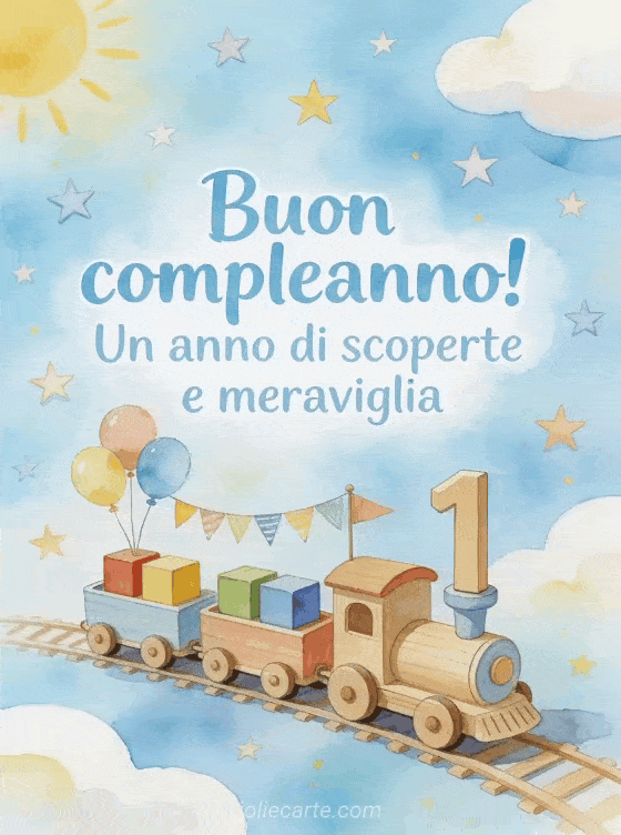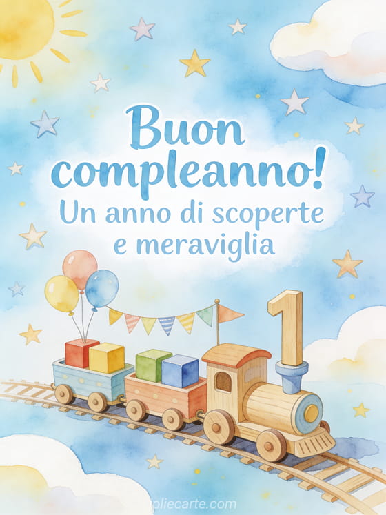 Festeggia il primo anno di un bimbo con un biglietto in acquerello delicato che mostra cubi di legno con il numero 1, un trenino giocattolo con palloncini e festoni, nuvole morbide, stelle e luce azzurro cielo. Scopri anche bebè augura buon compleanno, buon compleanno mio bebè 2 anni o testo compleanno bimbo 1 anno.
