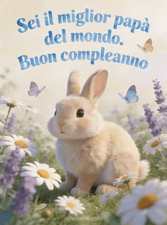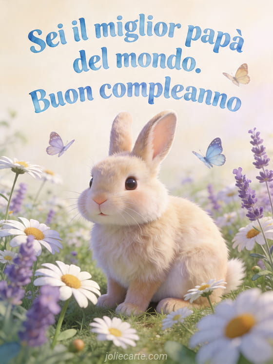 Invia al tuo papĂ un affettuoso messaggio di compleanno con questo dolce biglietto con un adorabile coniglio beige tra margherite, lavanda e farfalle. Scopri anche buon compleanno suocero, testo compleanno papĂ umoristico e buon compleanno mio papĂ .