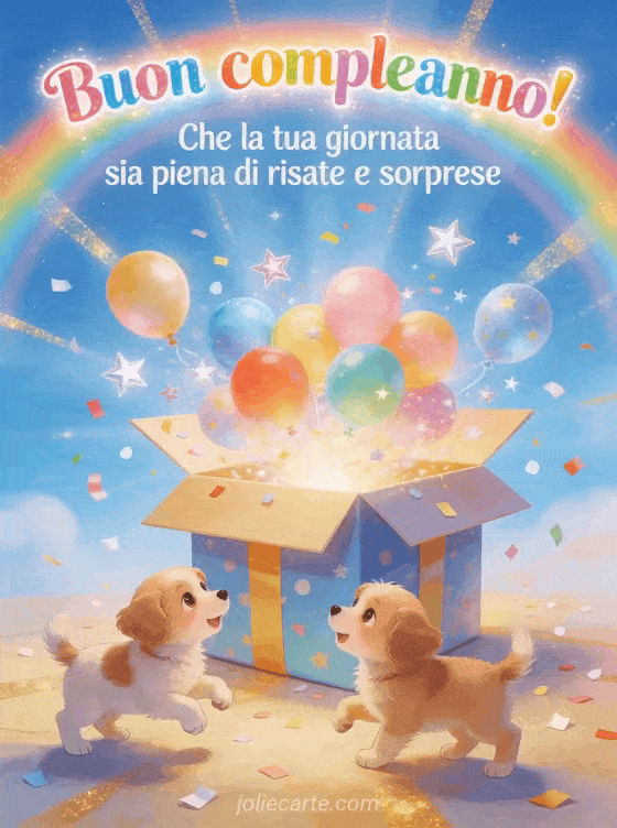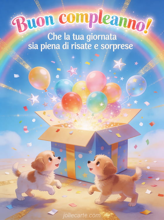 Invia questo magico biglietto di compleanno con due adorabili cuccioli che osservano un'esplosione di palloncini colorati e coriandoli da un pacco regalo gigante. Un modo allegro per augurare buon compleanno a un bambino. Scopri anche un biglietto di compleanno per bambine o un biglietto di compleanno per bambini.