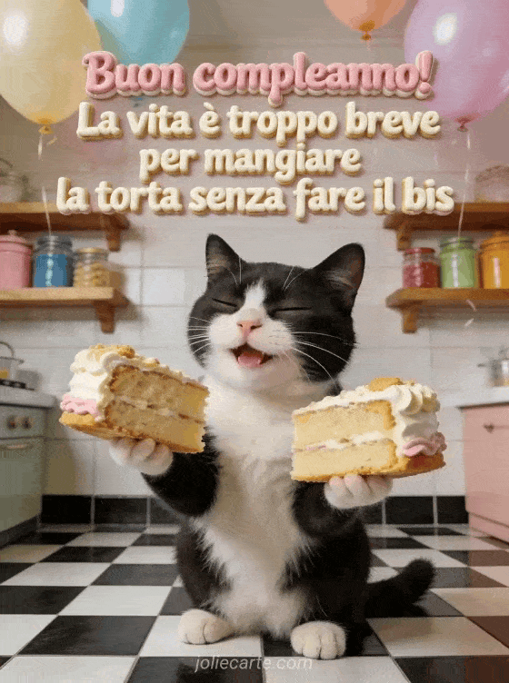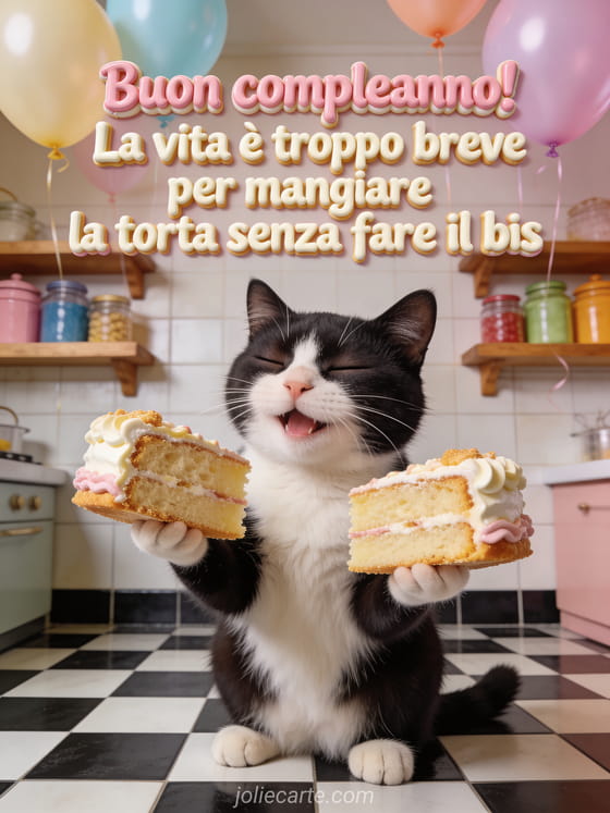 Falli ridere con questo divertente biglietto di compleanno con un gatto fotorealistico bianco e nero con due fette di torta. Scopri anche una gif compleanno gatto divertente o una gif compleanno divertente.