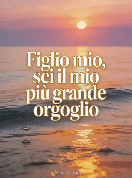 Condividi un biglietto sincero di compleanno per tuo figlio con un tramonto fotorealistico su un mare calmo, riflessi dorati e un messaggio tenero di orgoglio. Scopri anche un buon compleanno mio figlio citazione, un compleanno per un figlio o un buon compleanno mio ometto.