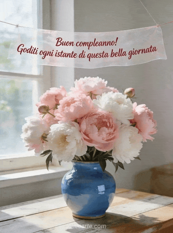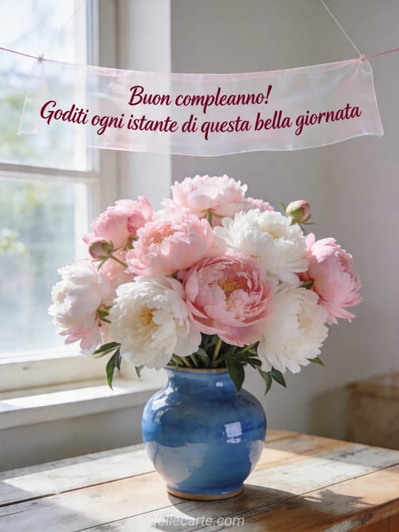 Buon compleanno! Goditi ogni istante di questa bella giornata un messaggio di compleanno elegante con peonie e luce soffusa