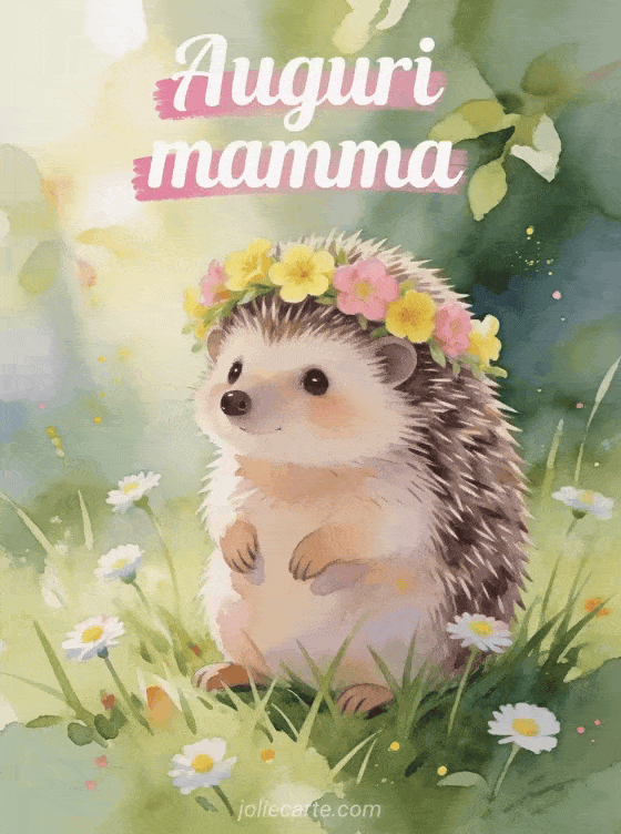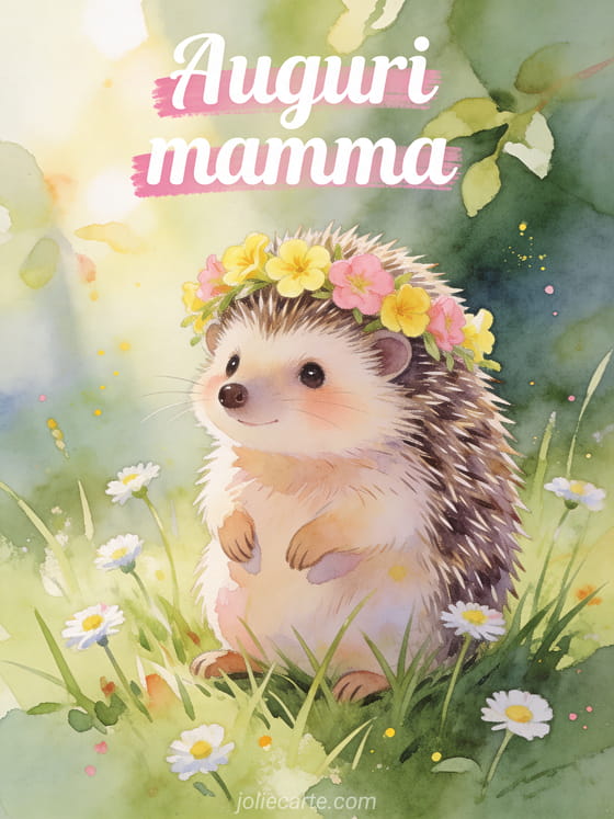 Festeggia la tua mamma con questa adorabile cartolina Auguri mamma con un tenero riccio che indossa una corona di primule gialle e rosa tra le margherite in primavera. Scopri anche una cartolina festa della mamma gratuita o una cartolina festa della mamma.