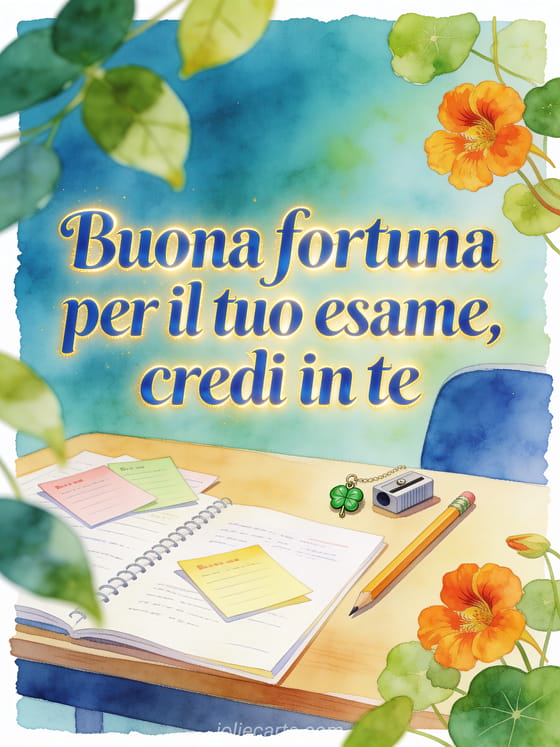 Sostieni qualcuno prima di un esame con questo biglietto ad acquerello, con schede di ripasso, un temperamatite portafortuna, un piccolo charm verde e fiori di cappuccina. Scopri anche messaggio di buona fortuna per un concorso, immagine buona fortuna con un cavallo o buona fortuna incoraggiamento gif.