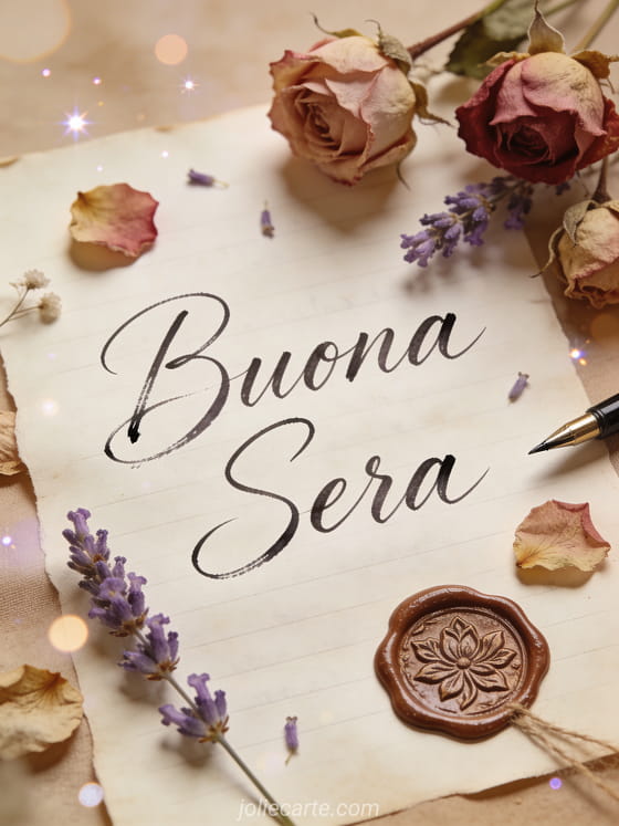 Invia un bel testo per augurare buona sera con questa cartolina gratis con una lettera scritta a mano e fiori secchi. Scopri anche buona sera baci o una buona sera immagine jpg.