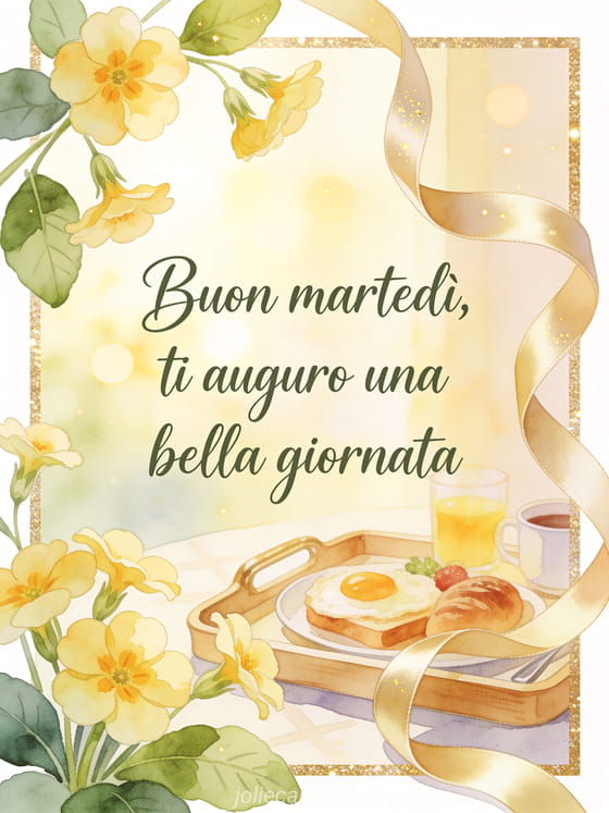 Invia buon martedì, ti auguro una bella giornata con calligrafia verde salvia, primule, un nastro di raso e un vassoio da colazione luminoso. Scopri anche buon martedì invernale gif, buon martedì amici immagine o bellissime immagini buon martedì.