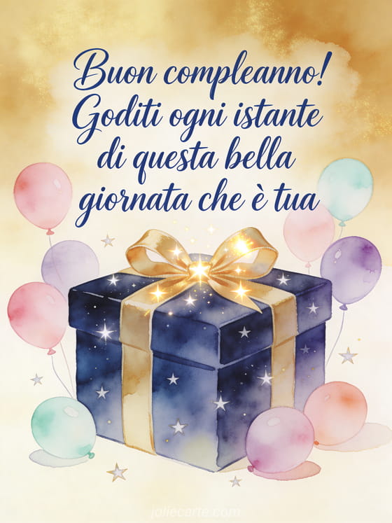 Invia un testo per compleanno con una cartolina luminosa fatta di regalo, palloncini pastello e stelle dorate per festeggiare un giorno unico. Scopri anche testo cartolina compleanno, messaggio compleanno e messaggio compleanno sms.