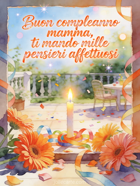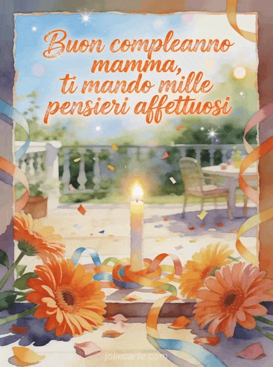 Invia alla mamma un messaggio amorevole di compleanno con calligrafia corallo, gerbere luminose, una candela accesa e una scena allegra nel patio. Puoi condividere anche una gif animata buon compleanno mamma gif, un buon compleanno mamma testo semplice o un buon compleanno suocera testo.