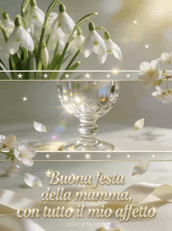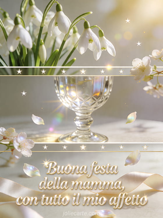 Condividi un testo per la festa della mamma in un biglietto fotorealistico a tre pannelli con bucaneve freschi, un vaso di cristallo, petali chiari, nastri di seta e piccole stelle. Scopri anche poesie per la festa della mamma, immagini buona festa della mamma o fotografie della festa della mamma.