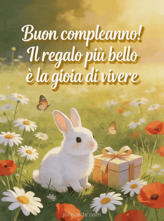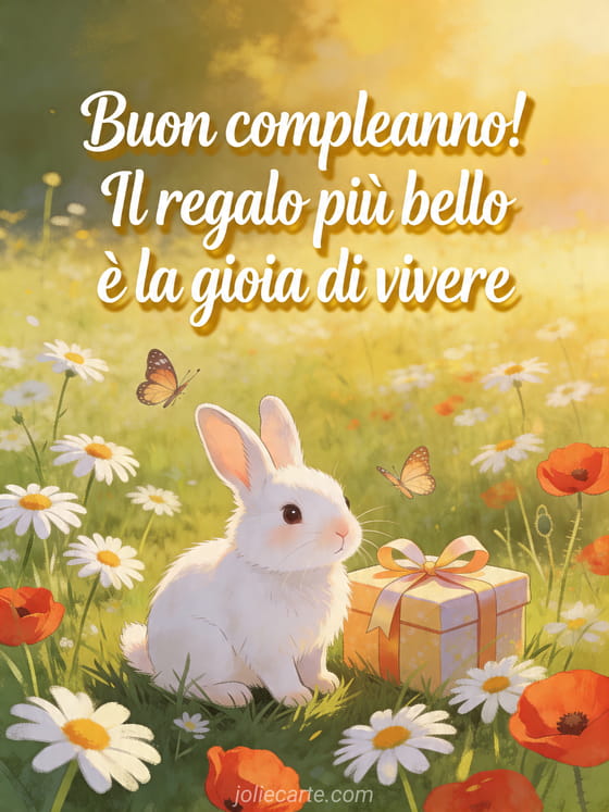Invia un tenero augurio di compleanno con questo dolce biglietto con un piccolo coniglio bianco in un prato fiorito con margherite, papaveri, farfalle e un regalo confezionato. Scopri anche messaggio buon compleanno simpatico, frase originale compleanno e messaggio simpatico per augurare buon compleanno.