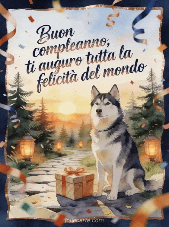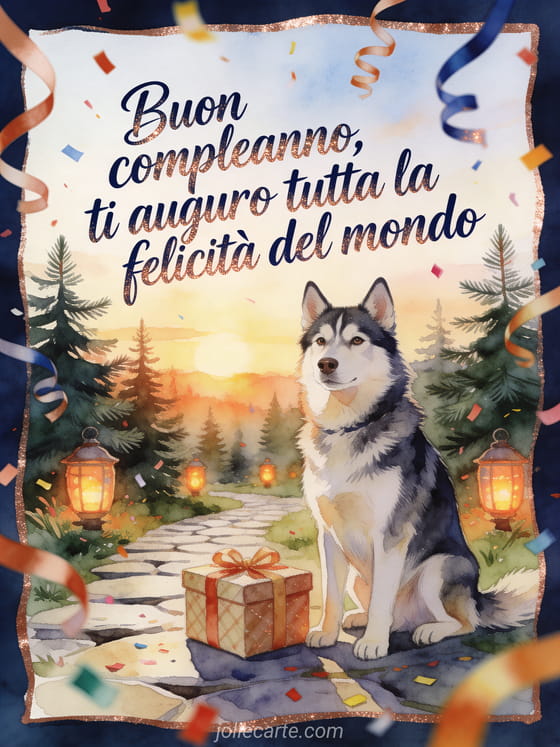 Invia un augurio di compleanno toccante con un fiero cane husky accanto a un regalo incartato in un giardino di pini all'alba. Nastri, coriandoli luminosi e lanterne accese creano una scena calda per augurargli tutta la felicità del mondo. Scopri anche una poesia per il compleanno di mio figlio, una poesia di compleanno per mio figlio o una poesia di compleanno per mio figlio.