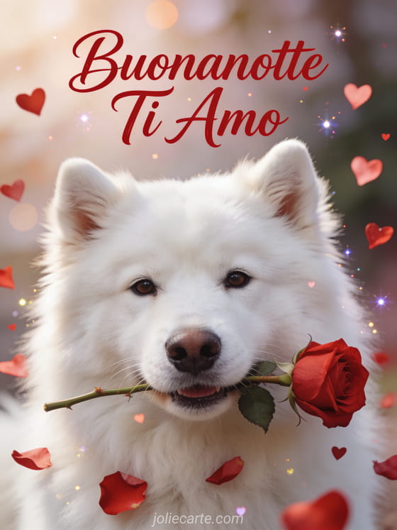 Invia questo romantico biglietto di buonanotte con un soffice Samoiedo bianco dallo sguardo amorevole che tiene una rosa rossa in bocca in un'atmosfera da sogno con particelle di luce scintillanti. Un modo dolce per dire buonanotte al tuo amore. Scopri anche un biglietto animato di buonanotte per innamorati o un biglietto romantico di buonanotte.
