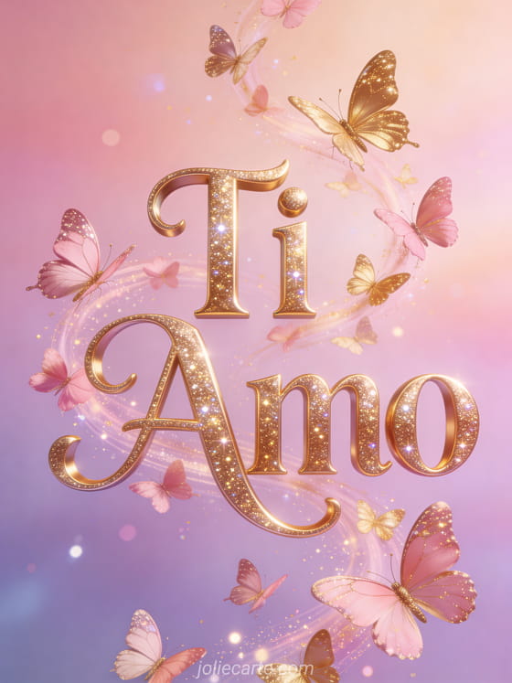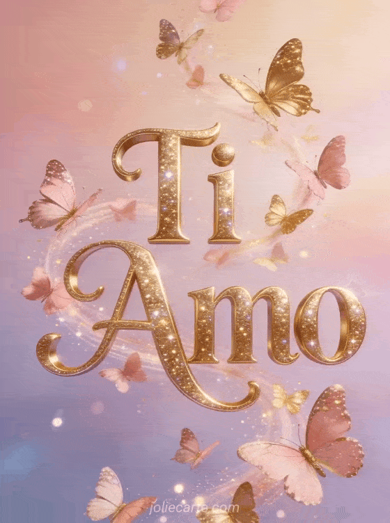 Invia questa incantevole gif animata con il testo Ti Amo scritto in lettere dorate scintillanti, avvolto da un vortice di farfalle rosa e dorate. Scopri anche un messaggio d'amore per lei ti amo o una cartolina il mio cuore ti dice ti amo.