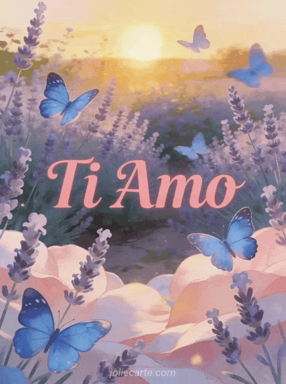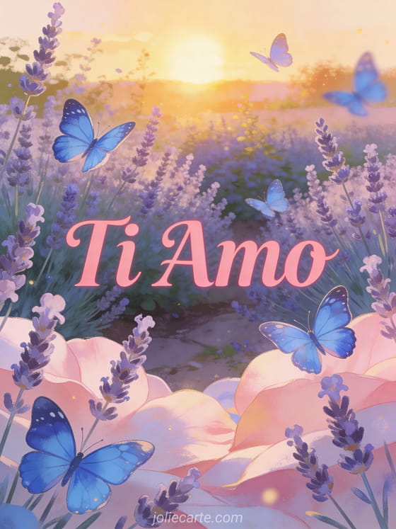 Esprimi il tuo amore con questa splendida cartolina Ti Amo, decorata con farfalle blu morpho in un giardino di lavanda al tramonto. Scopri anche una cartolina animata ti amo o una cartolina emoji d'amore.