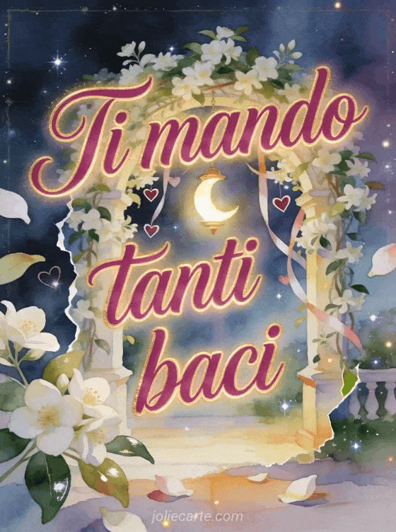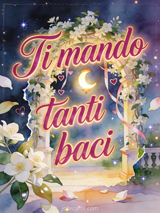 Manda tanti baci in un pergolato di gelsomino ad acquerello, con una lampada a luna crescente accesa, nastri a cuore e luce calda scintillante. Puoi condividere anche mandare baci gif, pioggia di baci immagini o baci di animali gif.