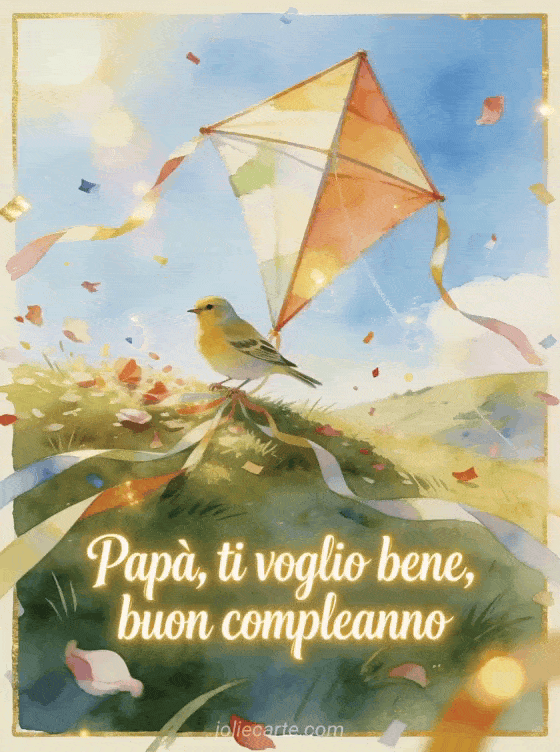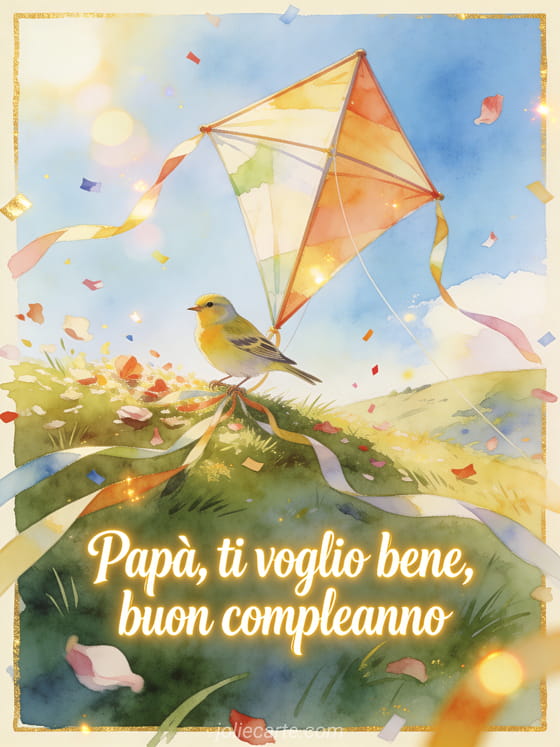 Condividi un messaggio di ti voglio bene buon compleanno papĂ in un prato soleggiato ad acquerello, con un verzellino posato su un grande aquilone festivo e nastri, petali e coriandoli oltre il bordo. Puoi scegliere anche compleanno di papĂ , disegno compleanno papĂ o tua figlia buon compleanno papĂ da tua figlia.