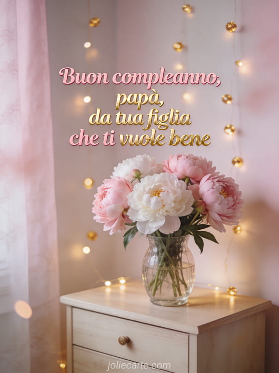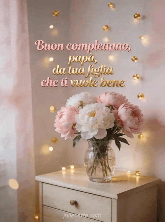 Condividi un biglietto tua figlia buon compleanno papĂ con lettere rosa e dorate, peonie delicate e calde luci dorate. Scopri anche un buon compleanno papĂ ti voglio bene, un buon compleanno papĂ disegno o un testo compleanno papĂ .