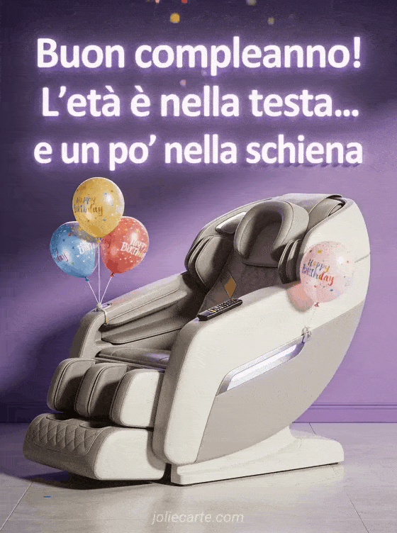 Invia questo biglietto animato di umorismo di buon compleanno con una poltrona massaggiante high-tech e palloncini di compleanno. Scopri anche un immagine compleanno umorismo o un umorismo compleanno.