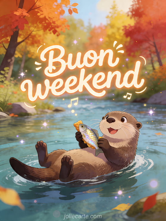 Condividi questo divertente biglietto di buon weekend con una lontra giocherellona che galleggia nel fiume, un pesce e alberi d'autunno. Puoi anche scoprire augurare buon weekend con umorismo, gif animato buon weekend e un buon weekend.